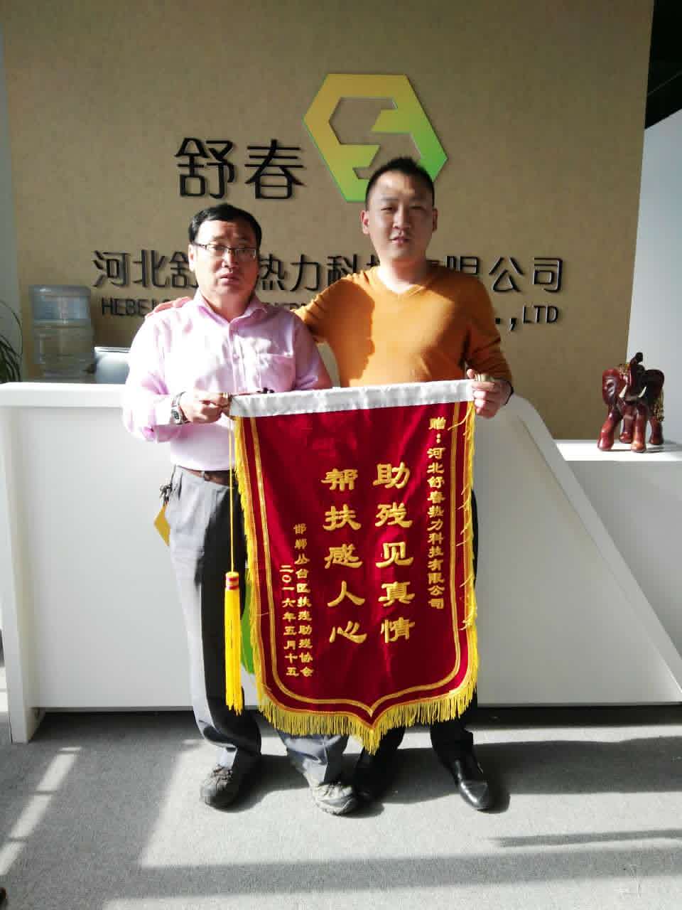 5月14日,河北舒春熱力科技有限公司董事長馬建崗與邯鄲市電供暖委員會成員組成了助殘志愿小分隊,一行5人帶著物資來到邯鄲市叢臺區(qū)肢殘協(xié)會開展了以“陽光助殘送溫暖”為主題的志愿服務(wù)活動。 5月17日,邯鄲市殘聯(lián)肢殘人協(xié)會副主席、叢臺區(qū)殘聯(lián)肢殘人協(xié)會主席張鴻斌來到河北舒春熱力科技有限公司,親自送上錦旗,對河北舒春熱力科技公司的無償捐贈表示衷心的感謝。 河北舒春熱力科技自誕生之日起就被賦予了一定的社會責(zé)任,一直秉承創(chuàng)造經(jīng)濟(jì)效益的同時積極承擔(dān)一定社會責(zé)任的經(jīng)營理念,努力創(chuàng)造一個企業(yè)與個人、與環(huán)境、與社會共同受益、和諧發(fā)展的良好氛圍。 近年來,河北舒春熱力科技有限公司陸續(xù)開展了陽光助殘等活動,讓我區(qū)肢殘家庭感受到了社會大家庭的關(guān)懷。