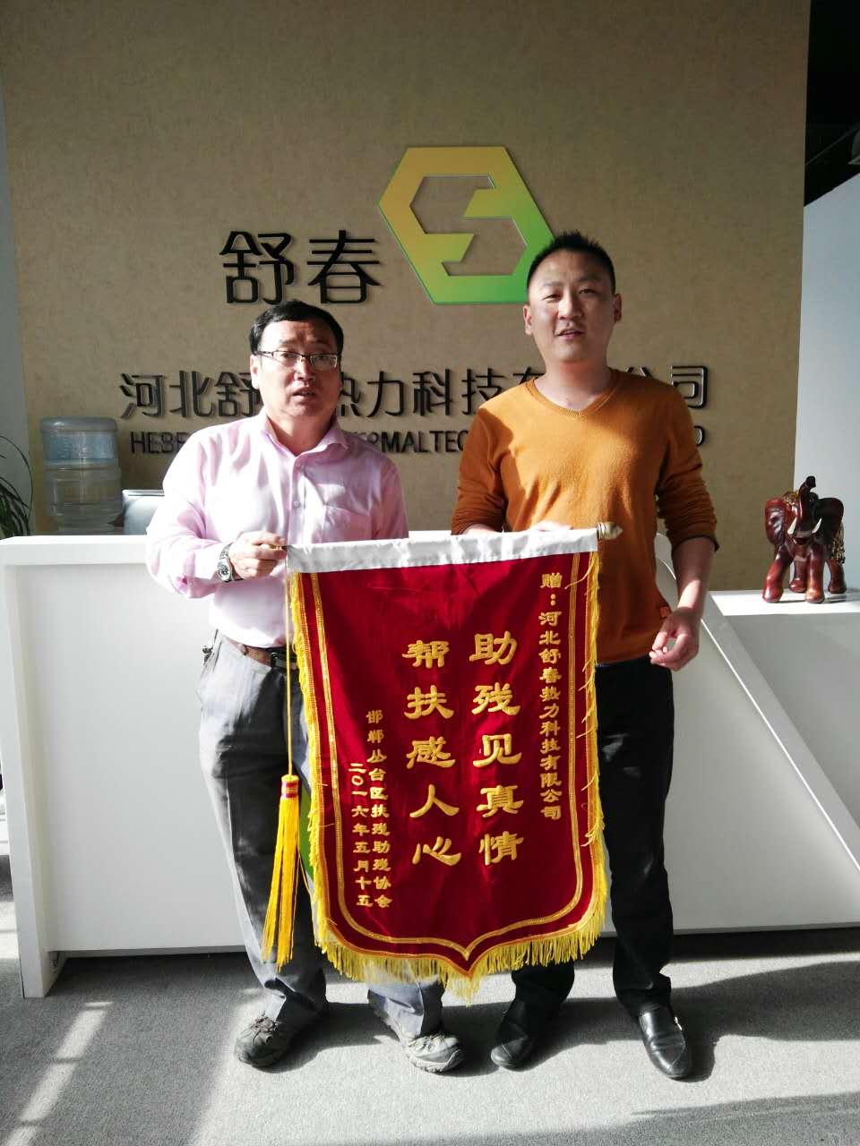 舒春送溫暖 助殘在行動 為深入貫徹黨的十八大和十八屆三中、四中、五中全會精神,認(rèn)真落實省市關(guān)于加快推進(jìn)小康社會進(jìn)程的要求,推進(jìn)“全國慈善城市”“全國文明城市”創(chuàng)建進(jìn)程,在全社會弘揚人道主義精神,倡導(dǎo)扶殘助殘的社會風(fēng)尚,推進(jìn)我區(qū)殘疾人事業(yè)全面發(fā)展,河北舒春熱力科技有限公司董事長馬建崗攜邯鄲市綠色環(huán)保聯(lián)合會副會長電供暖委員會秘書長焦琳一起走進(jìn)叢臺區(qū)肢殘協(xié)會。
